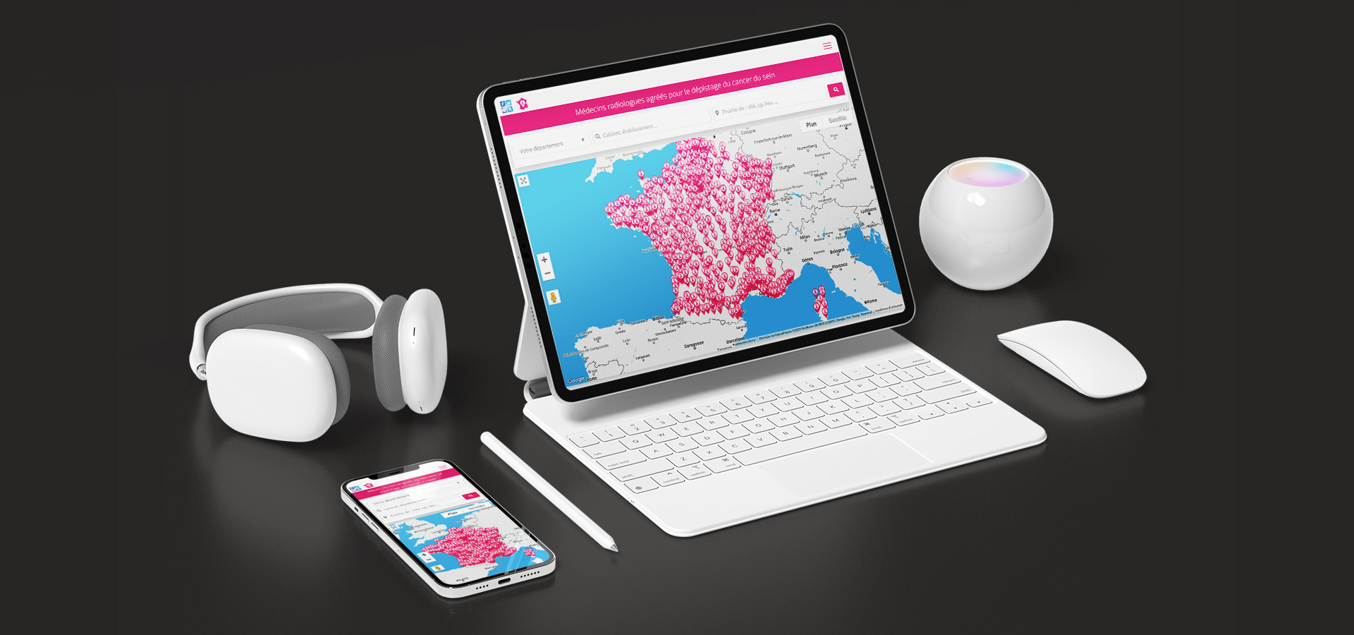 Dans le cadre de son engagement pour le dépistage du cancer du sein, la FNMR (Fédération Nationale des Médecins Radiologues) m’a confié la conception de son « Projet Octobre-Rose » : carte interactive et annuaire pour trouver les radiologues agréés : Identité visuelle, Expérience Utilisateur (UX) …